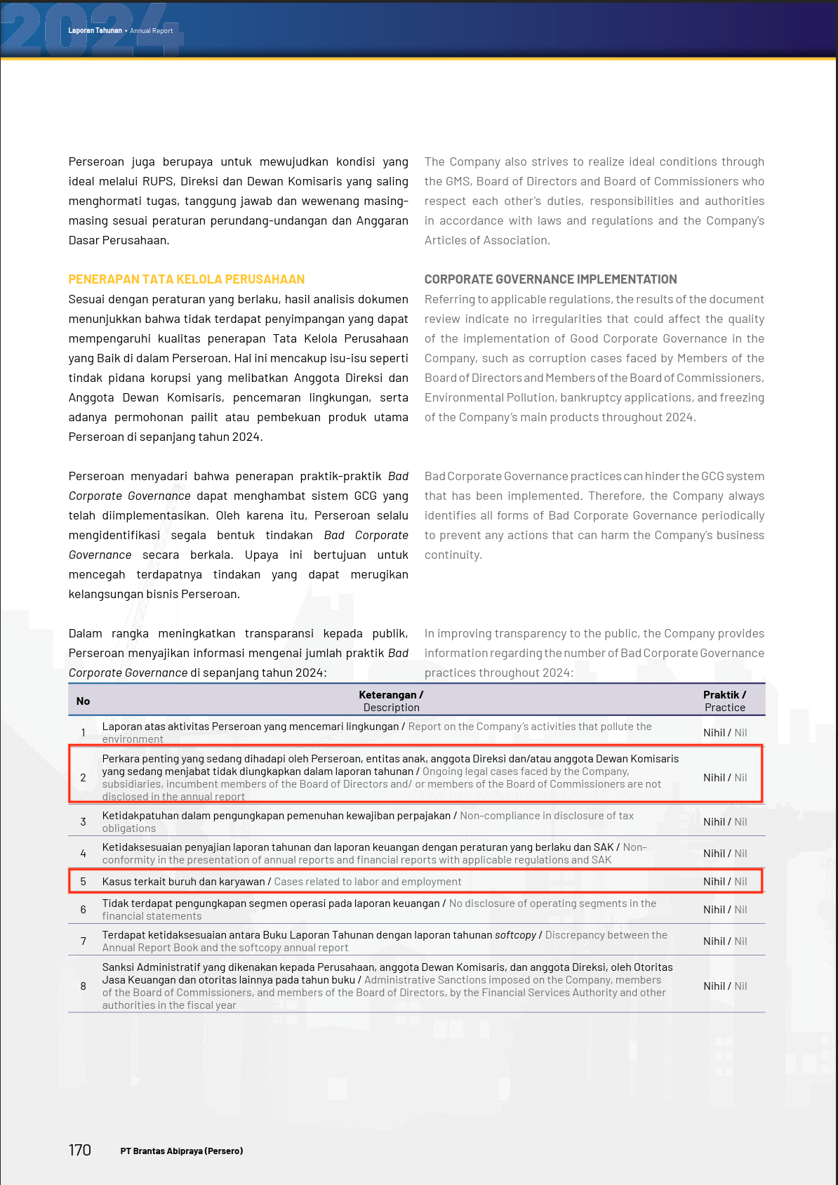 - Perkara penting yang sedang dihadapi oleh Perseroan, entitias anak, anggota Direksi dan/atau anggota Dewan Komisaris yang sedang menjabat tidak diungkapkan dalam laporan tahunan : Nihil